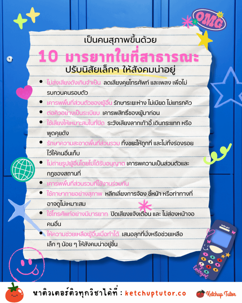 สวัสดีครับผมออนนี่มะเขือเทศ การมีมารยาทในที่สาธารณะ ไม่ใช่แค่เรื่องภาพลักษณ์ของตัวเรา แต่ยังช่วยให้สังคมน่าอยู่ขึ้น เหมือนเป็นกฎที่ไม่ได้เขียนไว้ แต่ทุกคนควรปฏิบัติอย่างเท่าเทียม บทความนี้รวบรวม 10 มารยาทพื้นฐาน ที่ใช้ได้ในทุกสถานที่